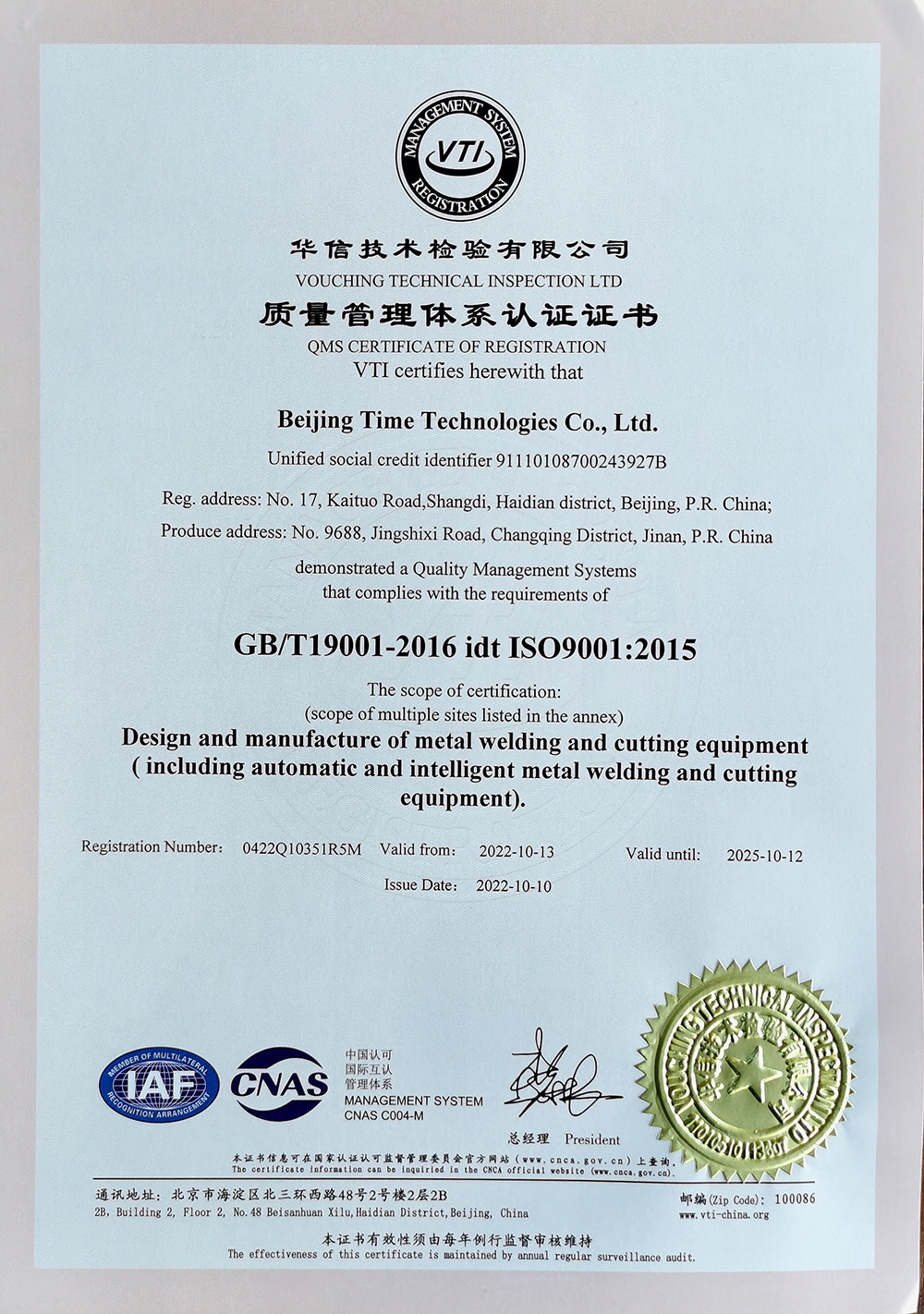 Quality management system certification certificate