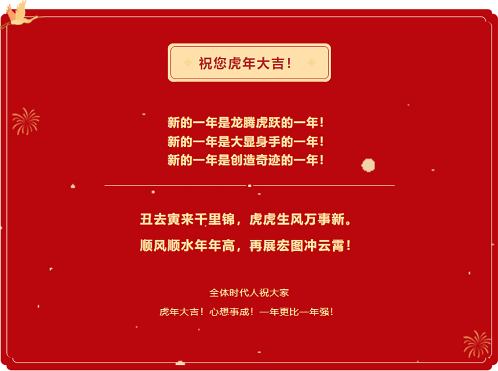 我們懷著熱切的渴望迎接虎虎生風(fēng)的新的一年。新年的發(fā)展藍(lán)圖已經(jīng)鋪開,全體時代人將躍躍欲試奔赴新的征程!新的戰(zhàn)場!