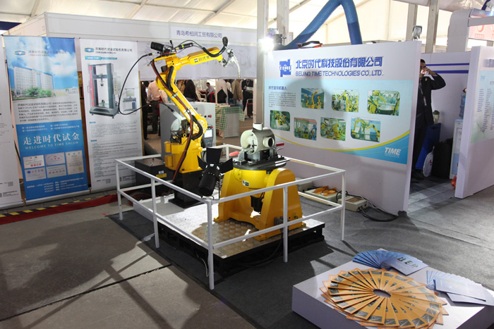 時代焊機(jī)作為職業(yè)教育領(lǐng)域的優(yōu)秀焊接設(shè)備供應(yīng)商應(yīng)邀參加了本屆展會。展會的展位都設(shè)置在組委會搭建的臨時性展棚中,時代展臺的位置在C館的中央。展會中只有三家企業(yè)與焊接專業(yè)相關(guān),時代是唯一一家專業(yè)焊接設(shè)備制造企業(yè),其余兩家都是焊接模擬培訓(xùn)儀的廠家。時代的展品以全新TD系列焊機(jī)集控系統(tǒng)、弧焊機(jī)器人設(shè)備為主。為了展示時代焊機(jī)的焊接教學(xué)系統(tǒng)解決方案,公司按真實尺寸1:1復(fù)制了焊接實操工位。工位里包括標(biāo)準(zhǔn)除塵系統(tǒng)、數(shù)字化焊接電源、焊機(jī)支撐架、多功能焊接操作架、監(jiān)控探頭、氣瓶架及氣瓶、工具柜、槍掛鉤等,與真正的教學(xué)工位一模一樣。許多從事焊接教學(xué)工作的校長、老師對時代焊接實操工位很感興趣,大家仔細(xì)觀摩并詢問了不少細(xì)節(jié)問題。大家紛紛評價時代的工位實物展示全面細(xì)致,令人耳目一新。工位外四套時代焊機(jī)聯(lián)網(wǎng)組成的集控系統(tǒng)同樣吸引了大家的目光,老師們紛紛詢問該系統(tǒng)在實際教學(xué)和生產(chǎn)中的實際意義和用途,對時代新型焊機(jī)的外觀也大加贊賞。最吸引觀眾目光的還是時代弧焊機(jī)器人系統(tǒng),本次展示包括機(jī)器人本體和小型變位機(jī)一套。機(jī)器人配合變位機(jī)焊接零件的過程,動作靈活準(zhǔn)確。為了強(qiáng)化展出效果,展臺上布置了兩盞大功率的射燈將機(jī)器人照亮,耀眼的燈光將時代機(jī)器人高精度、高智能的風(fēng)范勾畫得淋漓盡致。老師們對機(jī)器人的價格十分關(guān)心、同時還咨詢了不少教學(xué)系統(tǒng)編程問題。