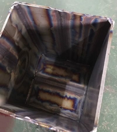 對(duì)于第三模塊中不銹鋼結(jié)構(gòu)件的焊接,個(gè)人觀點(diǎn)是其焊接難點(diǎn)要更甚于鋁合金的焊接。眾所周知不銹鋼在高溫狀態(tài)下非常容易氧化,而且變形量也較大。這次的不銹鋼結(jié)構(gòu)件組對(duì)完畢后,所有焊縫根據(jù)要求都不允許留間隙、開坡口焊接,并在背部充氣的情況下實(shí)現(xiàn)單面焊雙面成型(如圖7),它的焊接難點(diǎn)之一首先是為防止變形,如何選擇好組對(duì)之后的焊接順序,其次是焊接過程中如何能夠保證一次焊接背部成型和表面焊縫成型不氧化,乍聽起來好像這兩點(diǎn)有些矛盾,首先要想保證在不留間隙的情況向背面焊透,就要使熔池的溫度充分達(dá)到,而熔池溫度一旦過高焊縫表面就很容易氧化發(fā)黑,本屆比賽各路選手也是各顯其能,對(duì)于氬弧焊噴嘴的使用從6號(hào)嘴到10號(hào)甚至更大都有使用。其實(shí)從理論上來講,要想使氬弧焊接不銹鋼表面成型好,顏色好,主要就是氣體的保護(hù)效果,如果比賽允許使用氬氣保護(hù)拖罩進(jìn)行三重保護(hù),即熱影響區(qū)也保護(hù)起來,那么焊縫達(dá)到銀白色的金屬光澤也是有可能的,但這次只允許兩重保護(hù)(即內(nèi)充氣和氬弧槍本身氣體),那么對(duì)于焊縫的正表面只能采取大口徑噴嘴進(jìn)行,才能擴(kuò)大保護(hù)范圍,如果條件允許,也可以采用噴嘴內(nèi)裝有濾網(wǎng)的大口徑噴嘴進(jìn)行焊接,這樣的氣體保護(hù)會(huì)更均勻。但前提是采用大噴嘴口徑的焊槍對(duì)焊接過程中選手對(duì)熔池觀察的視線會(huì)有所影響,也要逐漸適應(yīng)。這次大賽對(duì)于大噴嘴的使用只有少數(shù)單位想到了這一點(diǎn)。隨著本次大賽的結(jié)束,我想以后對(duì)于不銹鋼焊接的氧化問題,會(huì)有更多的單位熟悉、掌握,甚至想出更好的辦法來解決不銹鋼焊接氧化的問題。