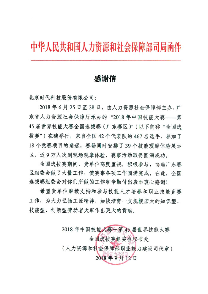 | 2018-09 | 第45屆世界技能大會全國選拔賽 組委會感謝信 | 中國人力資源和社會保障部職業(yè)能力建設司 |