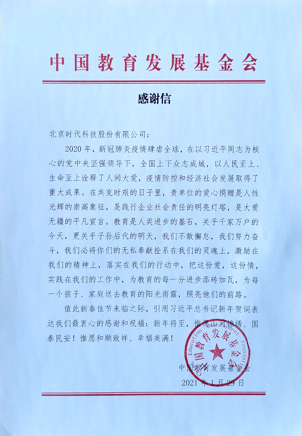 | 2021-02 | 感謝信 | 中國教育發(fā)展基金會 |