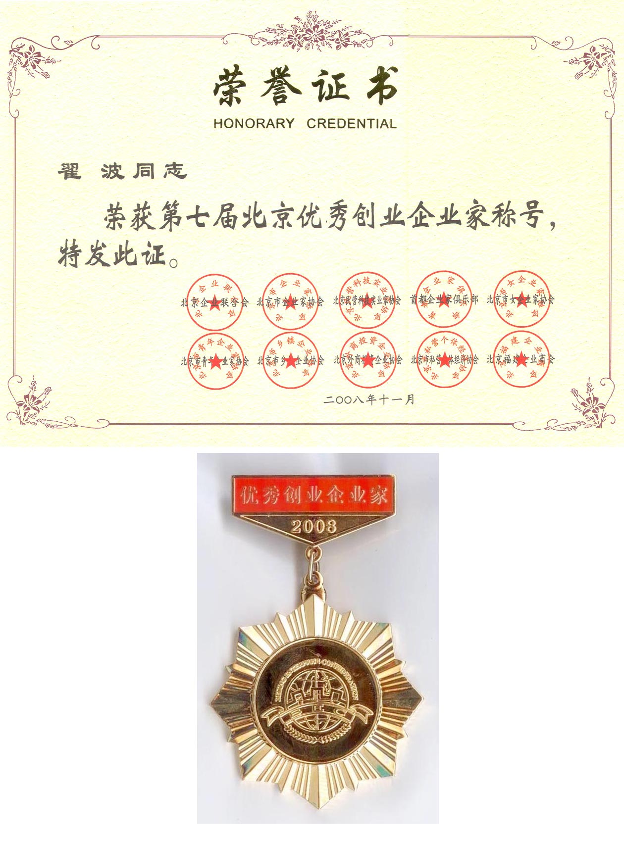 | 2008-11 | 第七屆北京優(yōu)秀創(chuàng)業(yè)企業(yè)家 | 北京企業(yè)聯合會、北京企業(yè)家協(xié)會 |