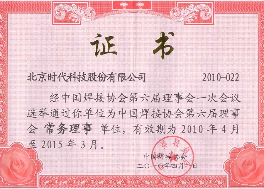 | 2010-04 | 中國焊接協(xié)會第六屆理事會常務理事單位 | 中國焊接協(xié)會 |