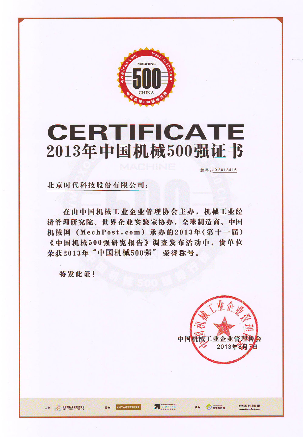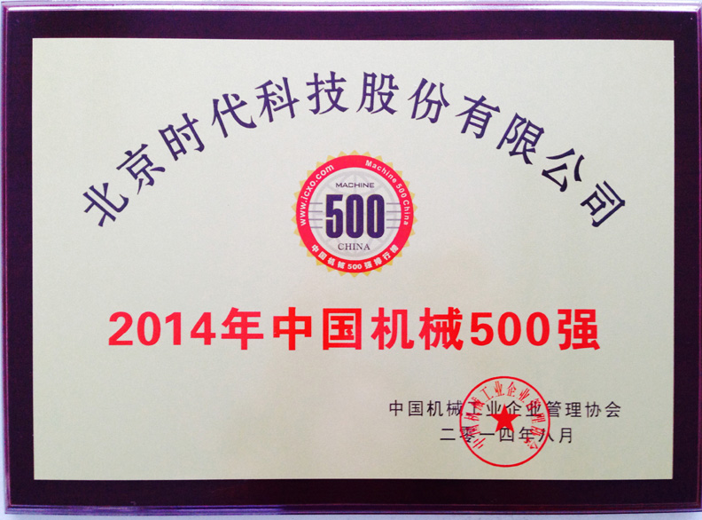 | 2013-08 | 中國機械500強 證書 | 中國機械工業(yè)企業(yè)管理協(xié)會 |