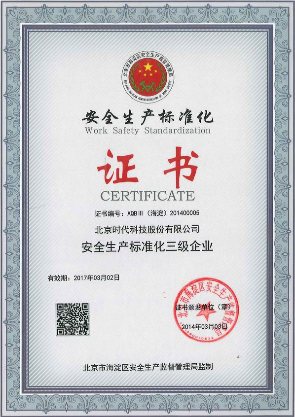 | 2014-04 | 安全生產標準化證書 | 北京市海淀區(qū)安全生產監(jiān)督管理局 |