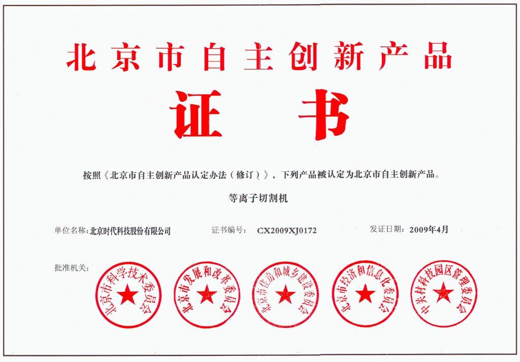 | 2009-04 | 北京市自主創(chuàng)新產品(等離子切割機) | 北京市科學技術委員會 |