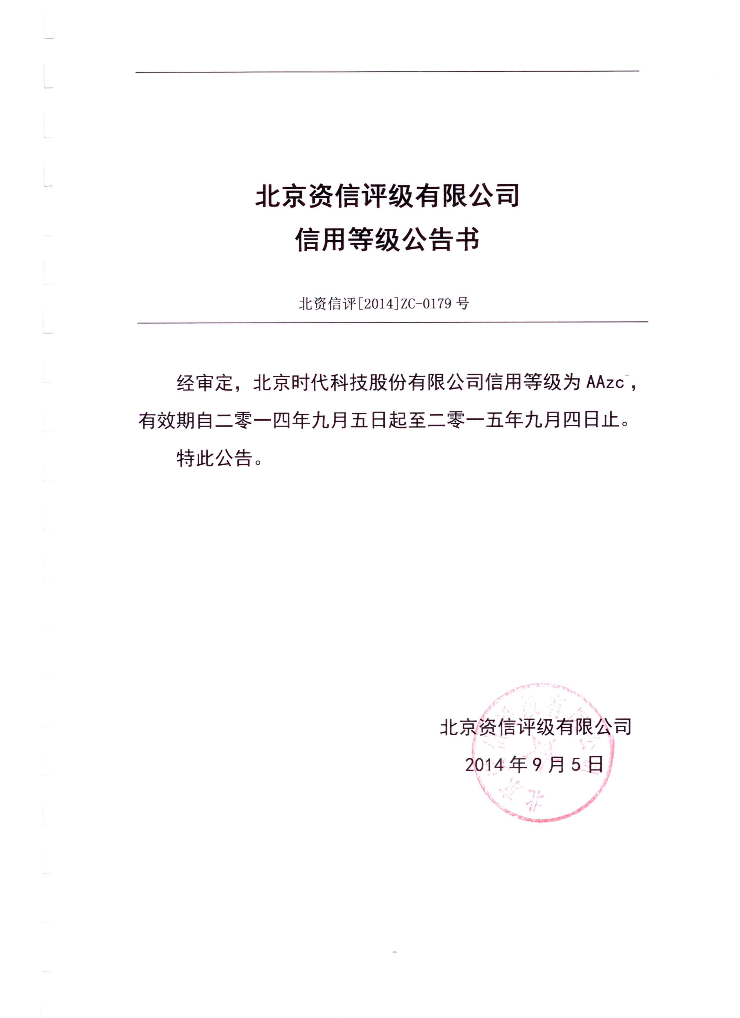 | 2014-11 | 北京時代科技股份有限公司信用等級公告書 | 北京資信評級有限公司 |