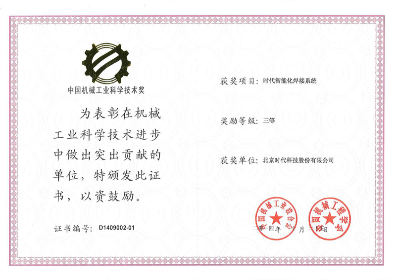 | 2014-12 | 中國機械工業(yè)科學技術獎 時代智能化焊接系統(tǒng) | 中國機械工程學會 |