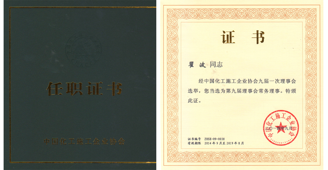 | 2014-09 | 中國化工施工企業(yè)協(xié)會常務理事 | 中國化工施工企業(yè)協(xié)會 |