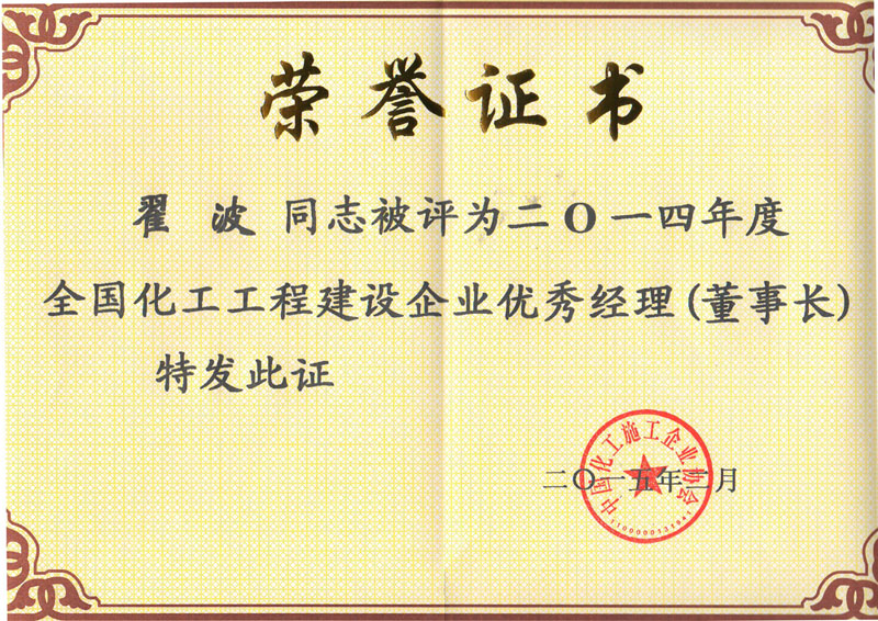 | 2015-02 | 2014年度全國化工工程建設單位 優(yōu)秀經理(董事長) | 中國化工施工企業(yè)協(xié)會 |