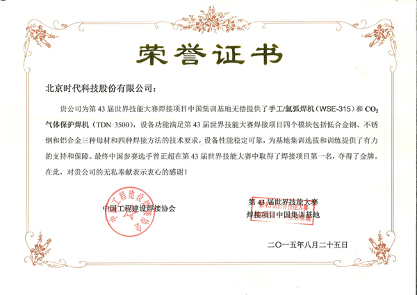 | 2015-08 | 第43屆世界焊接大賽焊接項目集訓用機 | 中國工程建設焊接協(xié)會 |