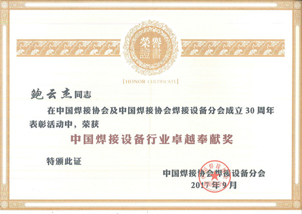 | 2017-09 | 中國焊接設備行業(yè)卓越奉獻獎 | 中國焊接協(xié)會焊接設備分會 |